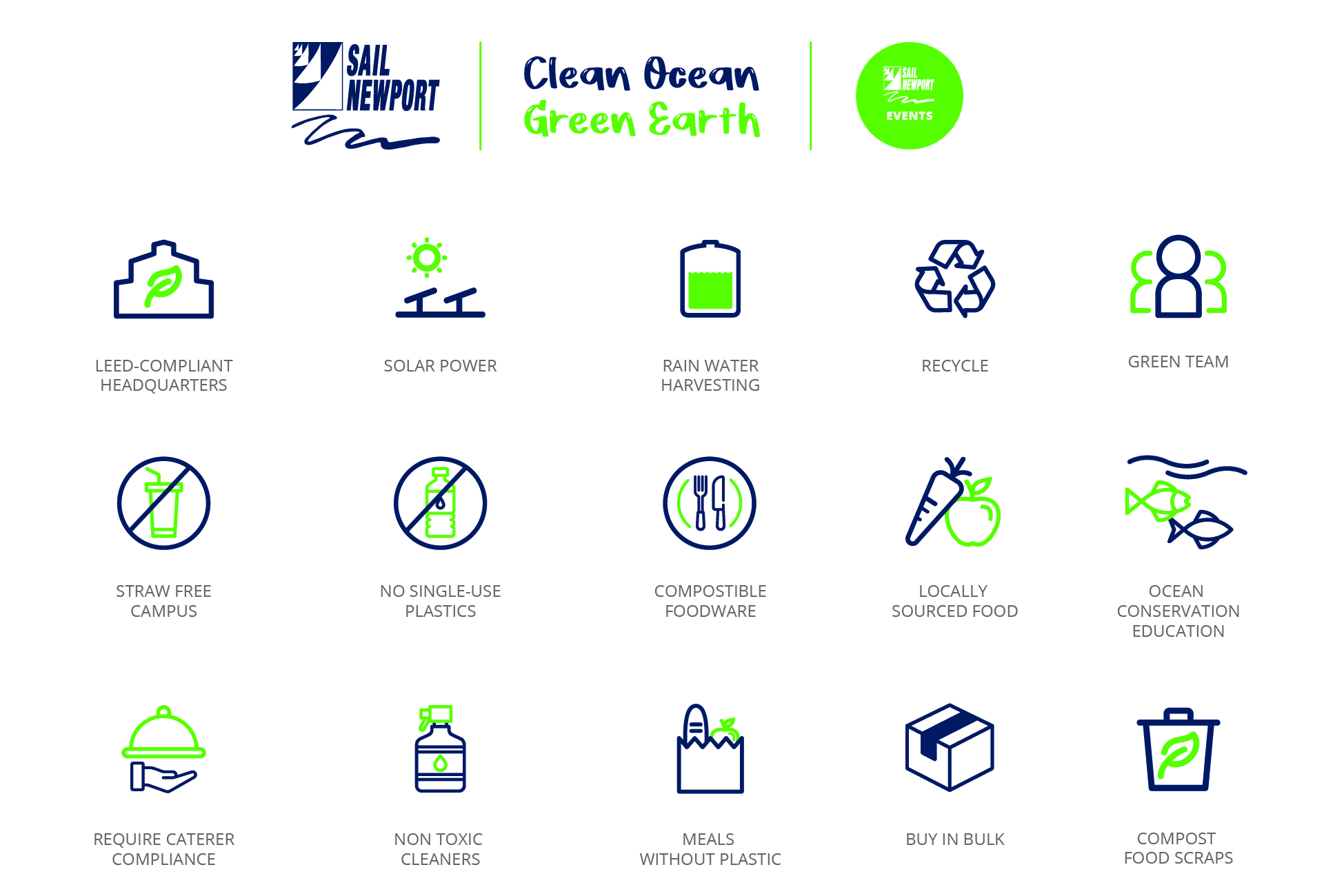 Sail Newport works to maximize our sustainability practices and limit our environmental impact. We require all vendors and clients to work with us on these efforts by abiding by the guidelines below: