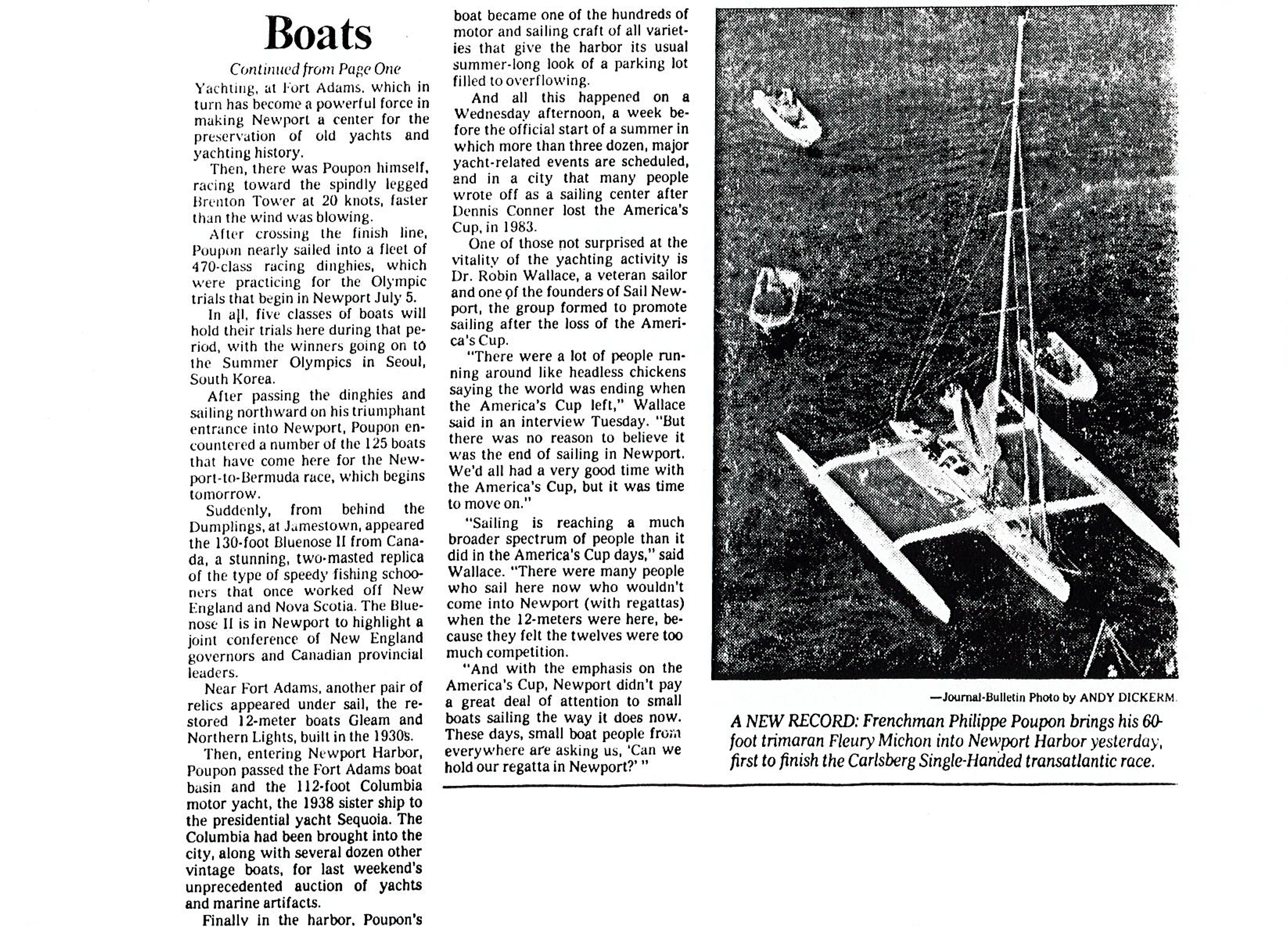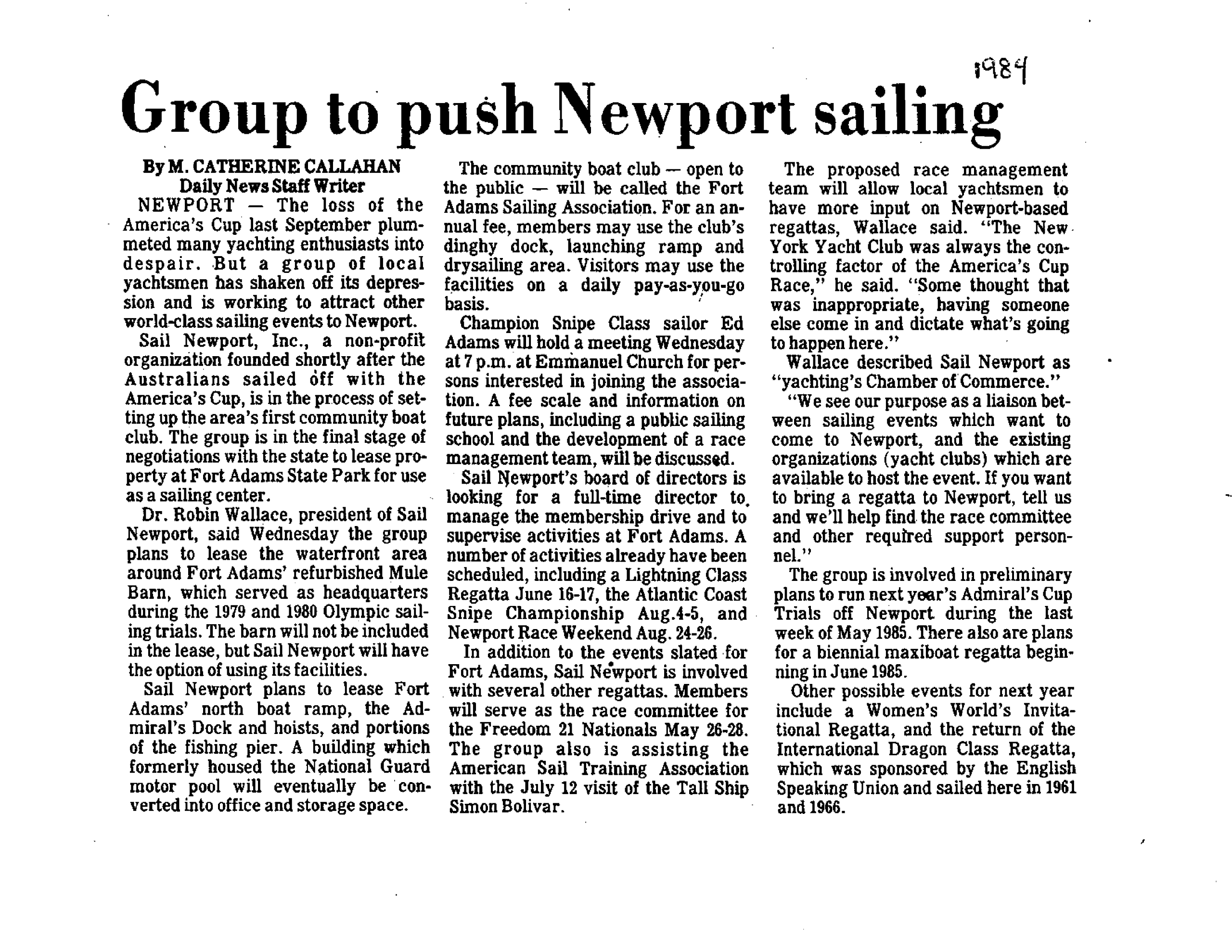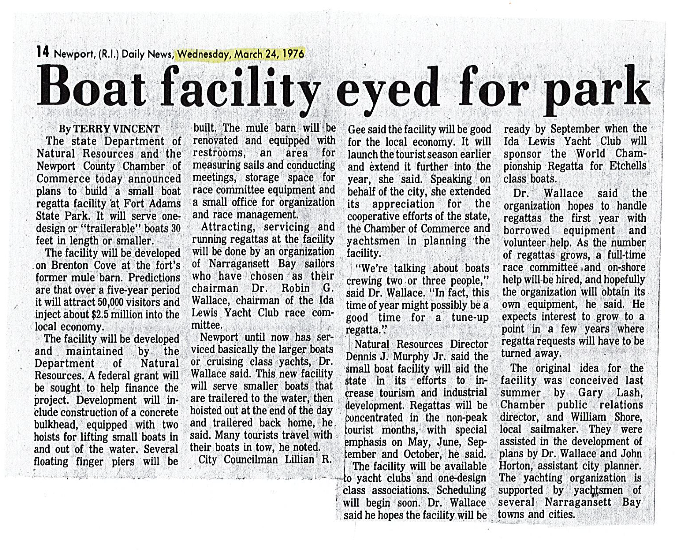 Dr. Robin Wallace, president of Sail Newport announced final stage of negotiations with the state for a lease on property at Fort Adams State Park for a sailing center, initial plans called for the establishment of a community boat club, to be called the Fort Adams Sailing Association. The state comfirms that under DEM Director Robert L. Bendick, Jr., they were in favor of “a non-exclusive sailing association” at Fort Adams that could “conduct races, provide sailong lessons and other appropriate activities.” Areas included in this first lease inclided the North boat ramp, the Admiral’s Dock and hoists and a portion of the finishing pier. Robin Wallace says in a Newport Daily News Article that his vision for Sail Newport is to be “Yachting’s Chamber of Commerce.” Champion Snipe Class sailor Ed Adams holds a meeting on Wednesday at Emmanuel Church for persons interested in joining the Fort Adams Sailing association