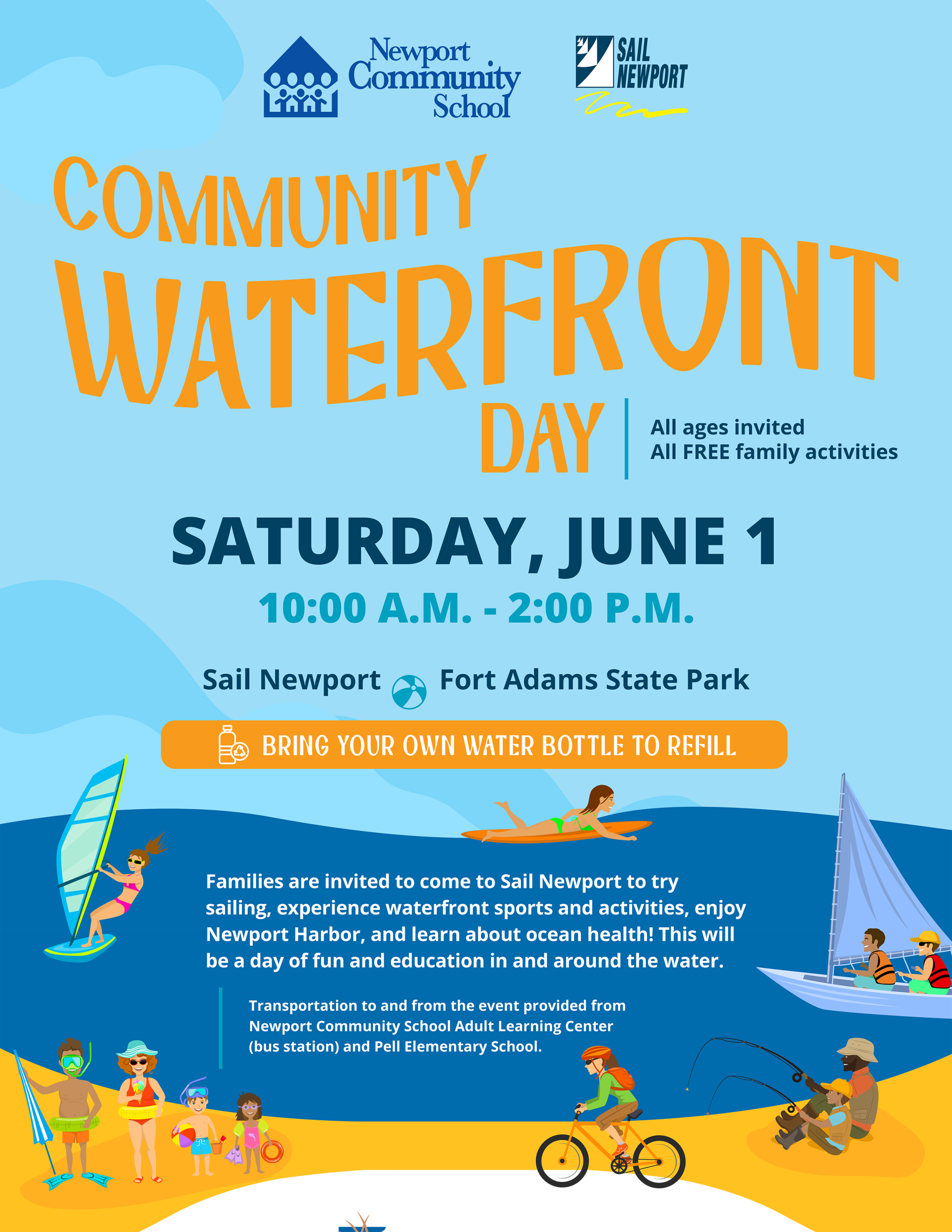 Community families from the Newport Public Schools were invited to Sail Newport in Fort Adams State Park for a day of waterfront fun. Activities included try sailing, waterfront sports and activities, and ocean health education. Transportation to and from the event provided from Newport Community School Adult Learning Center and Pell Elementary School.